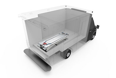 Alu-Unterbau inklusive VA-Wanne, Klappe, Gasfeder und Rückhaltesystem. Unterbau mit Verstaufach für Schaufeltrage oder Spinboard.